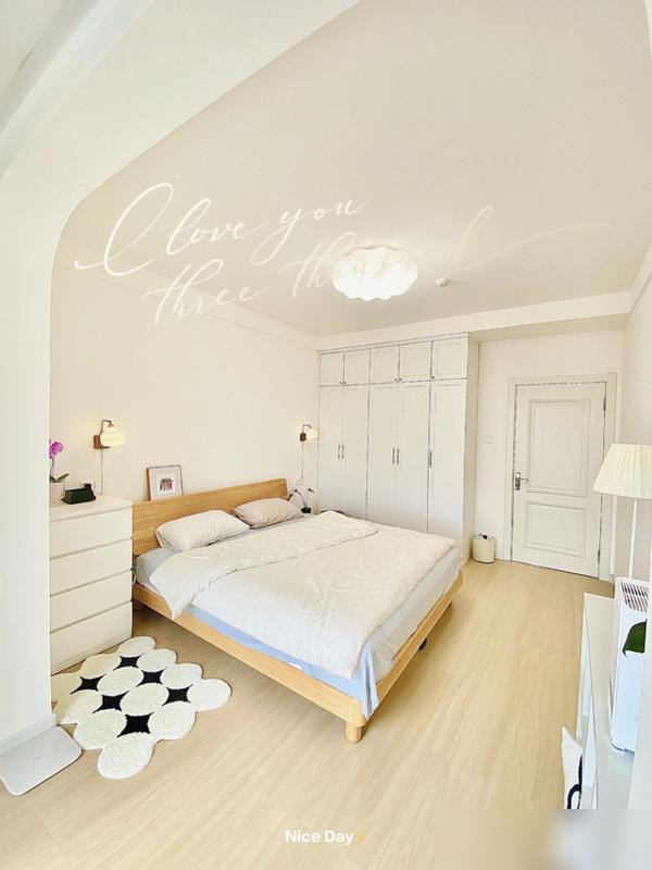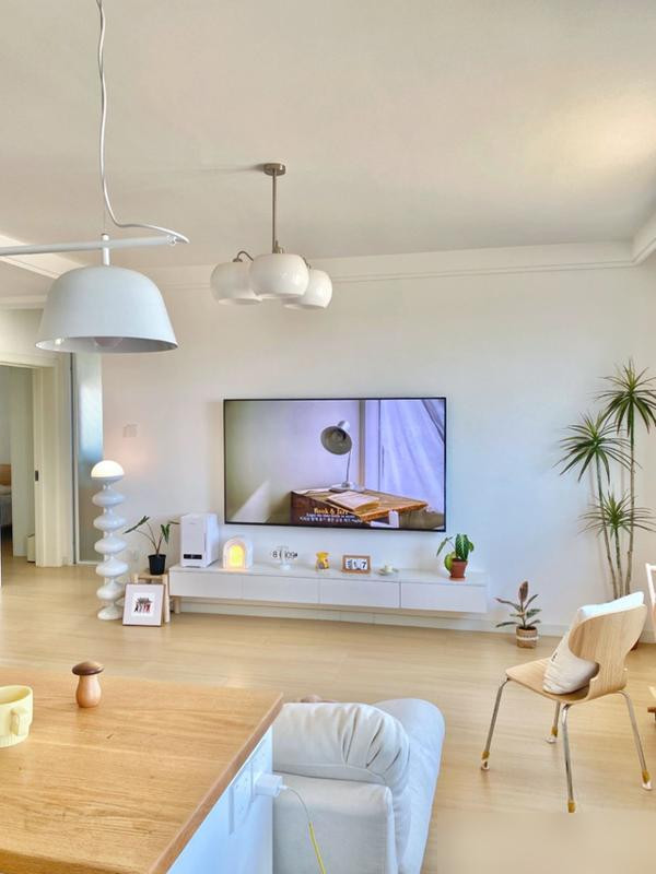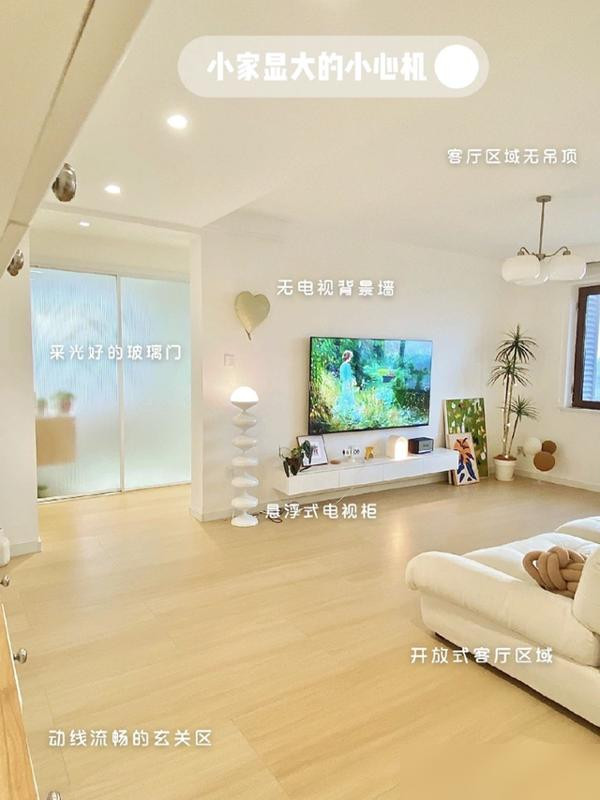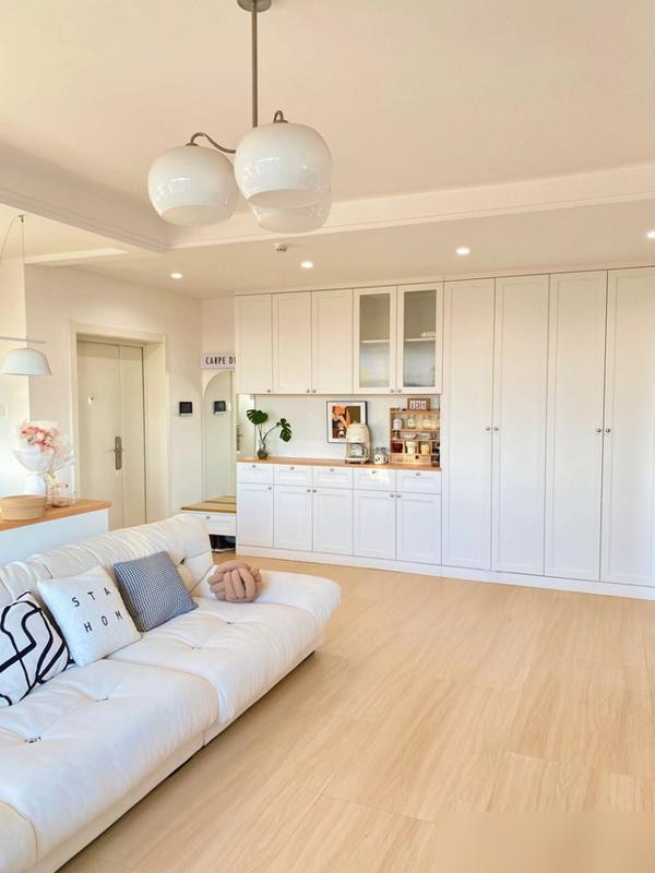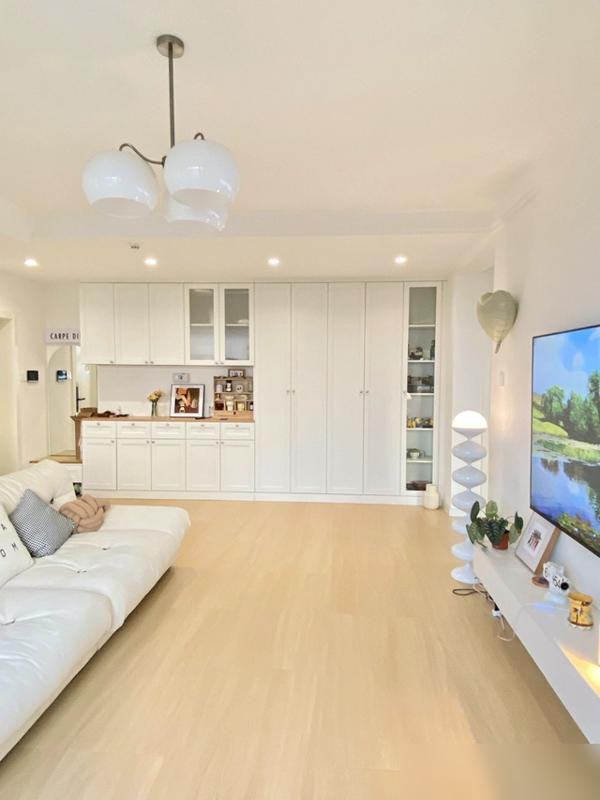 灯光和色彩搭配得好,小户型也能有层次感,米白色墙面配木地板,视觉延伸感超强。
