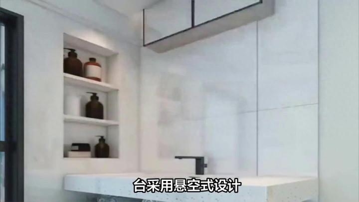 ·带壁龛的悬空洗手台。进门正对的洗手台采用悬空式设计,吊装在墙,轻盈灵动且便于清洁,无边角藏污纳垢之忧。白色柜体与水泥色墙壁、地面搭配和谐。洗手台上设置物台与洗手池,旁边掏了三层壁龛,收纳洗漱用品,从进门角度看不到杂物,卫生间更显整洁。