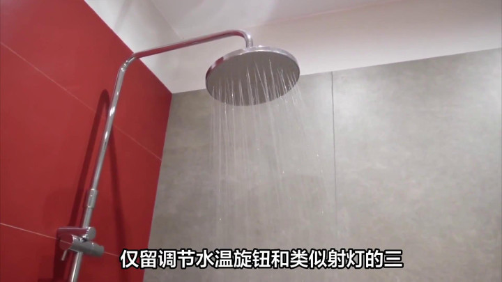·挨着窗户的浴室浴室花洒暗埋墙内,仅留调节水温旋钮和类似射灯的三出水花洒头,在无主灯照明下,颇具极简与工业风美感。
