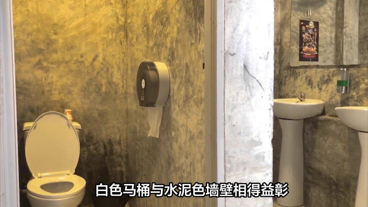 ·壁挂马桶隔间往里是壁挂式马桶隔间,空间虽小,但左右半墙遮挡,保证了如厕隐私。白色马桶与水泥色墙壁相得益彰。